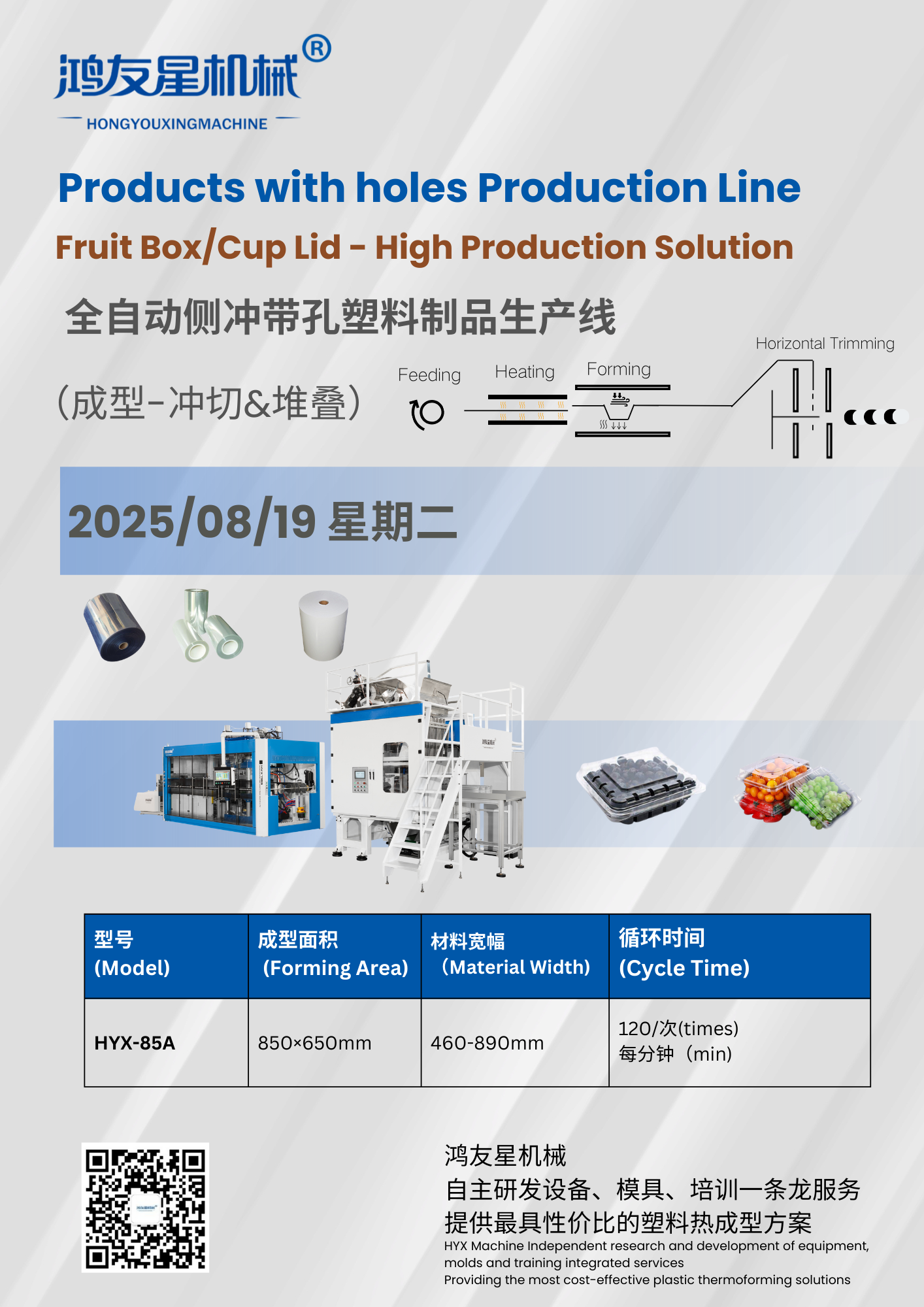 Nadaje się do produkcji wieczek do kubków, pudełek na truskawki i blistry z otworami bocznymi i dolnymi, maszyny do formowania blistrów (znane również jako maszyny blistrowe/maszyny do testowania przekrojów) to wysoce zautomatyzowane urządzenia, które są w stanie sprostać złożonym wymaganiom w zakresie opakowań i są szczególnie szeroko stosowane w przemyśle opakowań do żywności. Maszyny te nie tylko obsługują konwencjonalne formowanie blistrów, ale także precyzyjnie tworzą różne pozycje otworów, takie jak otwory boczne i dolne, aby spełnić różnorodne wymagania funkcjonalne opakowań.